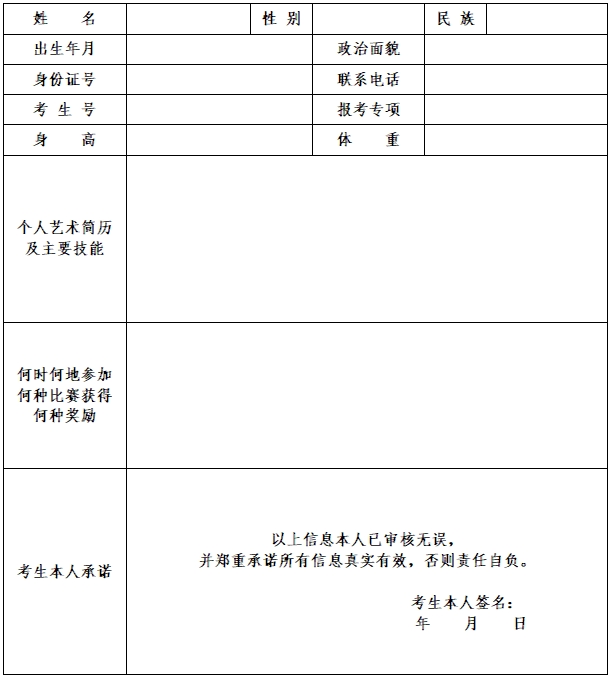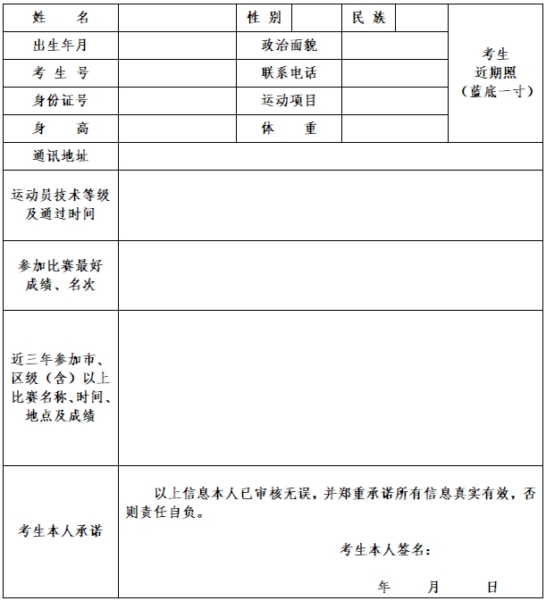 注:此表與相關(guān)其他材料統(tǒng)一發(fā)送至電子郵箱56689920 qq.com,在體育特長(zhǎng)生資格考試報(bào)到時(shí),上交本人簽名的報(bào)名表,同時(shí)提交證書(shū)證明原件材料。