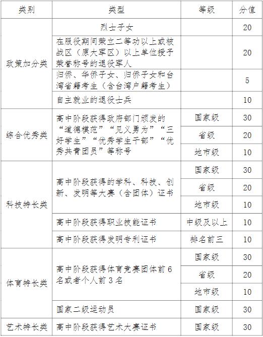 凡符合以下條件的考生,可申請加分。各類榮譽認定和加分標準如下:
