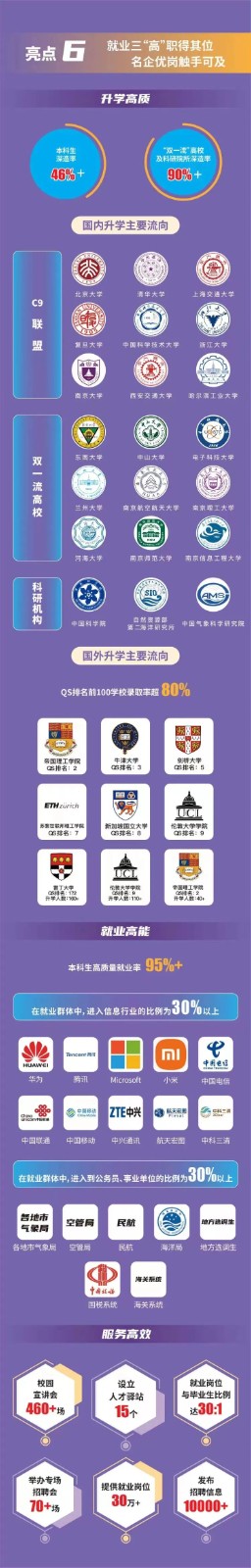 進(jìn)入南師學(xué)習(xí),就有更多機(jī)會進(jìn)一步深造,基地班、強(qiáng)化班、實驗班保研率達(dá)70%,本科生平均保研率超16%,升學(xué)出國(境)率更是接近半數(shù),各項指標(biāo)居全省前列。
