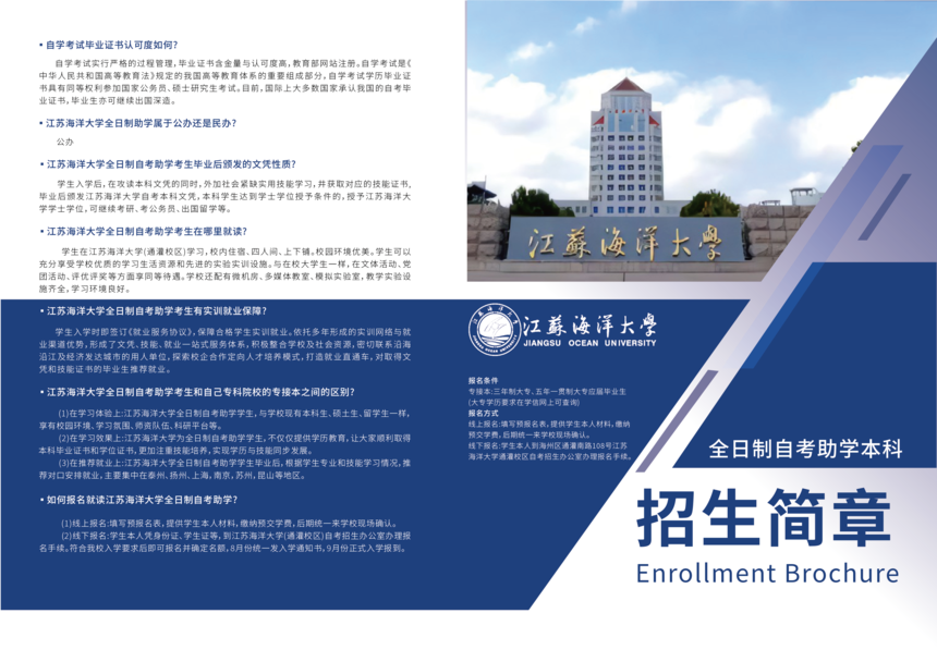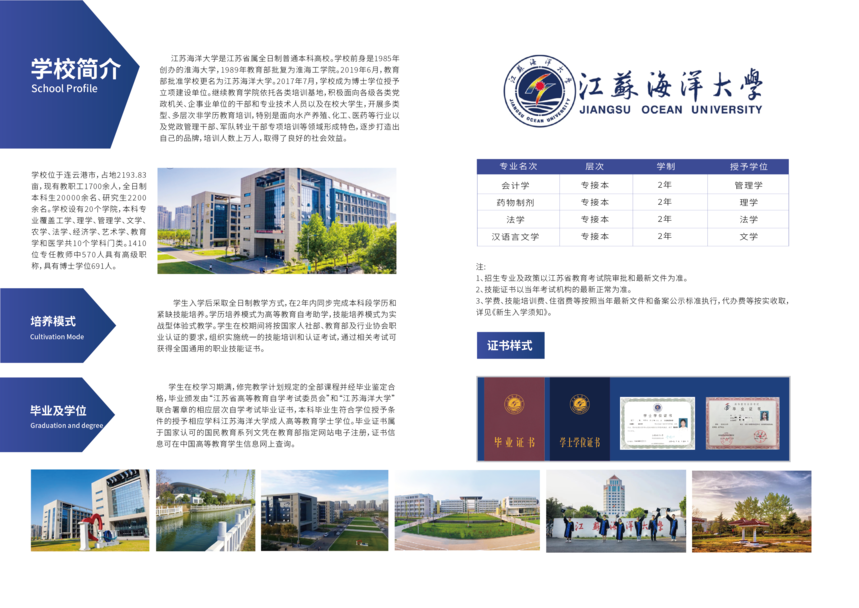畢業(yè)條件:修完考試計(jì)劃所規(guī)定的全部課程,考試及格,通過畢業(yè)論文答辯,發(fā)放由江蘇省教育自學(xué)考試委員會和江蘇海洋大學(xué)合署的畢業(yè)證書,教育部電子注冊。